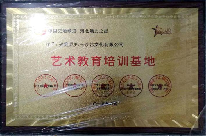 鄭氏砂畫制作榮獲“2018魅力之星河北少兒藝術(shù)盛典電視聯(lián)歡會(huì)”金獎(jiǎng),同時(shí)鄭氏砂藝文化有限公司被授予中國(guó)交通頻道·河北魅力之星“藝術(shù)教育培訓(xùn)基地”。