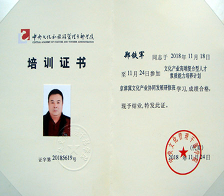 2018年11月18日至24日,興隆縣鄭氏砂藝文化有限公司執(zhí)行董事鄭鐵軍同志,受邀參加中央文化管理干部學(xué)院舉辦的“文化產(chǎn)業(yè)高端復(fù)合型人才素質(zhì)能力培養(yǎng)計(jì)劃—京津冀文化產(chǎn)業(yè)協(xié)同發(fā)展研修班”學(xué)習(xí),于11月24日圓滿結(jié)業(yè)。