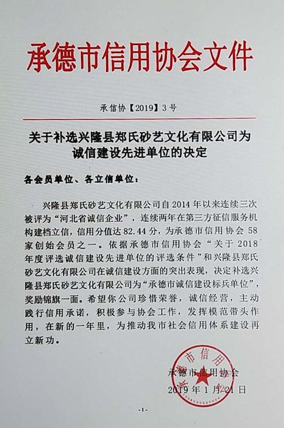 興隆縣鄭氏砂藝文化有限公司榮膺“承德市誠(chéng)信建設(shè)標(biāo)兵單位”
