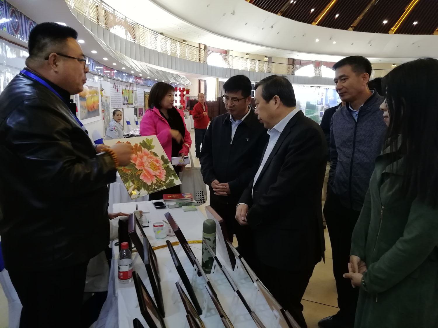 河北省文化和旅游廳黨組副書記 副廳長翟玉虎、市旅游和文化廣電局副局長王鵬飛在鄭鐵軍董事長的陪同下參觀了鄭氏砂畫展出作品,期間,董事長詳細(xì)的介紹了鄭氏砂藝非遺文化的發(fā)展歷程、工藝特點、制作手法、產(chǎn)品推廣現(xiàn)狀以及未來市場前景,并對領(lǐng)導(dǎo)提出的問題一一解答,最后,翟玉虎副書記對鄭氏砂藝予以充分的肯定,并提出要繼續(xù)努力,把非遺文化發(fā)揚(yáng)光大。
