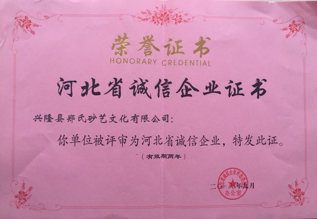 2018年9月27日,興隆縣鄭氏砂藝文化有限公司榮獲了由河北省誠(chéng)信企業(yè)評(píng)選委員會(huì)辦公室頒發(fā)的《河北省誠(chéng)信企業(yè)》稱(chēng)號(hào),這是繼2014年、2016年后連續(xù)第三次獲此殊榮,為構(gòu)建誠(chéng)信河北、和諧河北、促進(jìn)全省經(jīng)濟(jì)平穩(wěn)較快發(fā)展發(fā)揮了積極的帶頭作用,為推動(dòng)我省誠(chéng)信企業(yè)建設(shè)做出了一定的貢獻(xiàn)。鄭氏砂藝將珍惜榮譽(yù)、再接再厲,在創(chuàng)建誠(chéng)信企業(yè)活動(dòng)中不斷做出新成績(jī)。