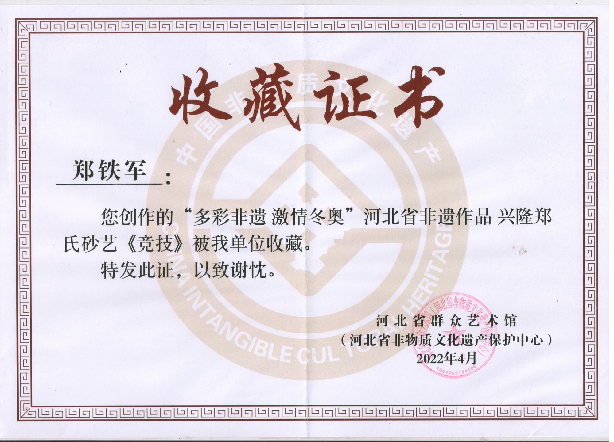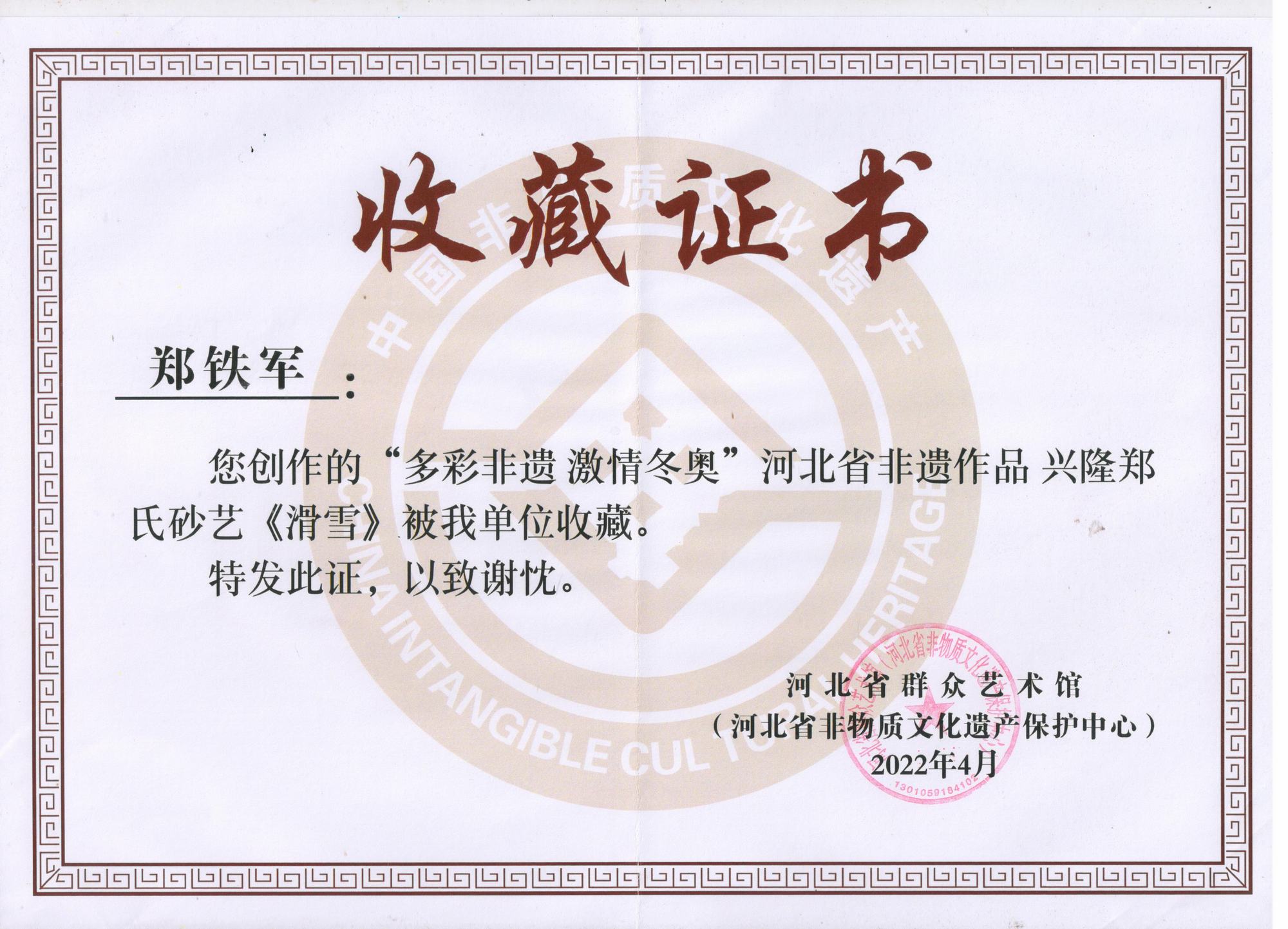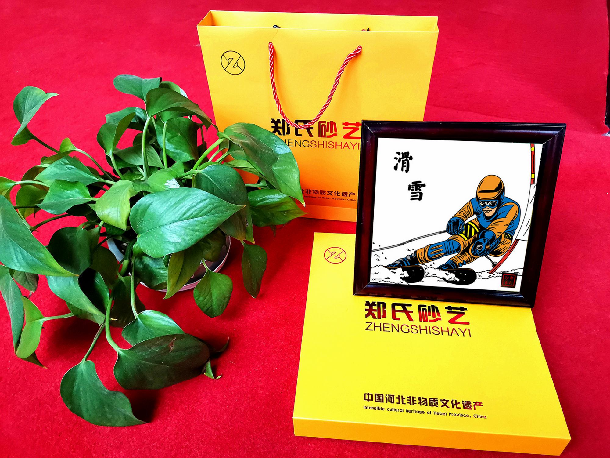 2022年北京冬奧會是我國重大歷史節(jié)點的重大標(biāo)志性活動,也是河北省推動京津冀協(xié)同發(fā)展、雄安新區(qū)規(guī)劃建設(shè)、冬奧會籌辦“三件大事”之一。因此省群眾藝術(shù)館(省非遺保護(hù)中心)按照河北省文化和旅游廳的部署在全省開展了“多彩非遺激情冬奧”非遺主題作品征集活動,本次作品以冬奧文化、冰雪文化、春節(jié)文化為題材,通過藝術(shù)展現(xiàn)冰雪運動,應(yīng)邀鄭氏砂藝執(zhí)行董事國際工藝美術(shù)大師鄭鐵軍創(chuàng)作的砂畫作品《滑雪》、《競技》兩幅作品參展,并被省群眾藝術(shù)館和省非物質(zhì)文化遺產(chǎn)保護(hù)中心永久收藏。