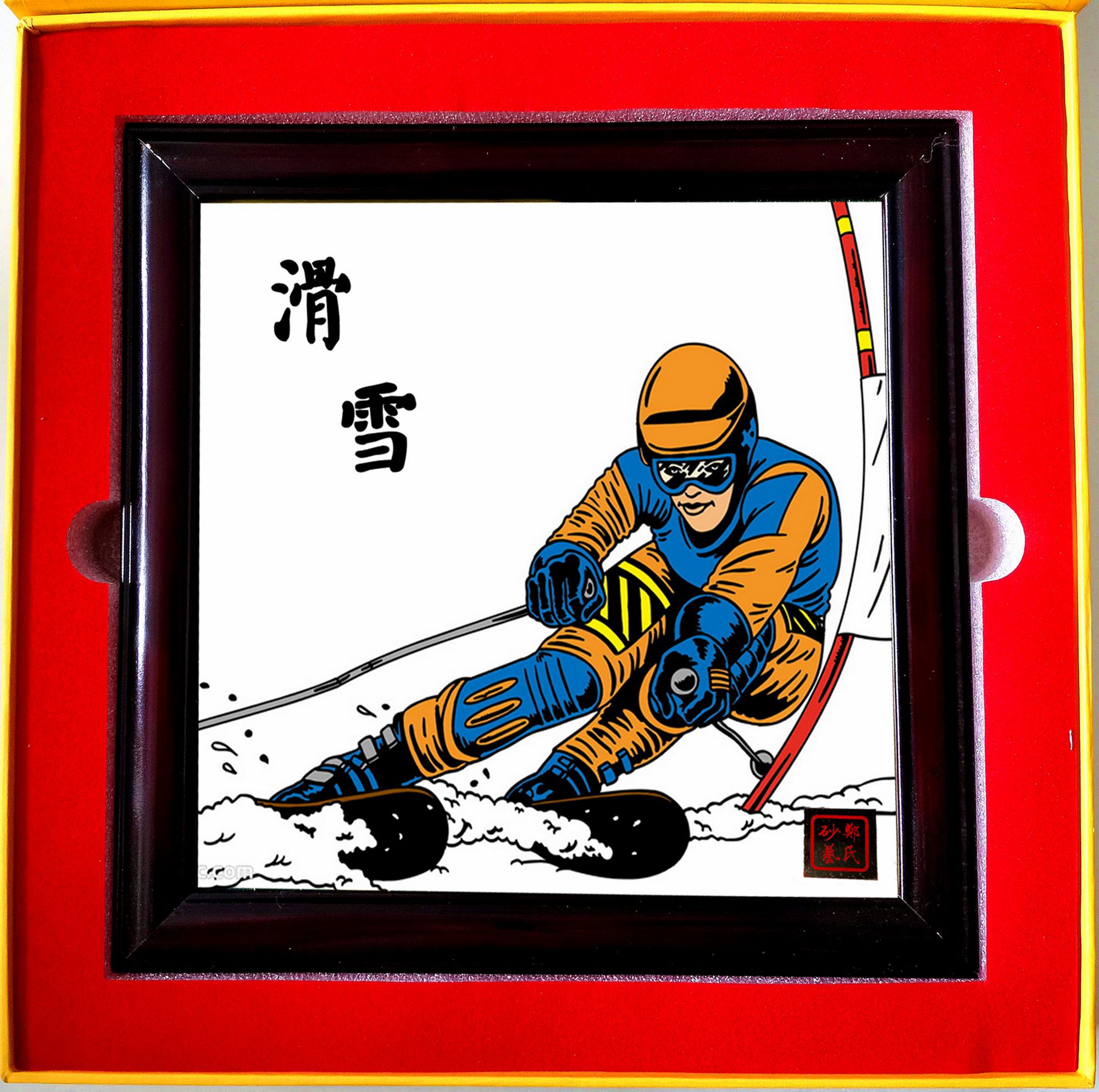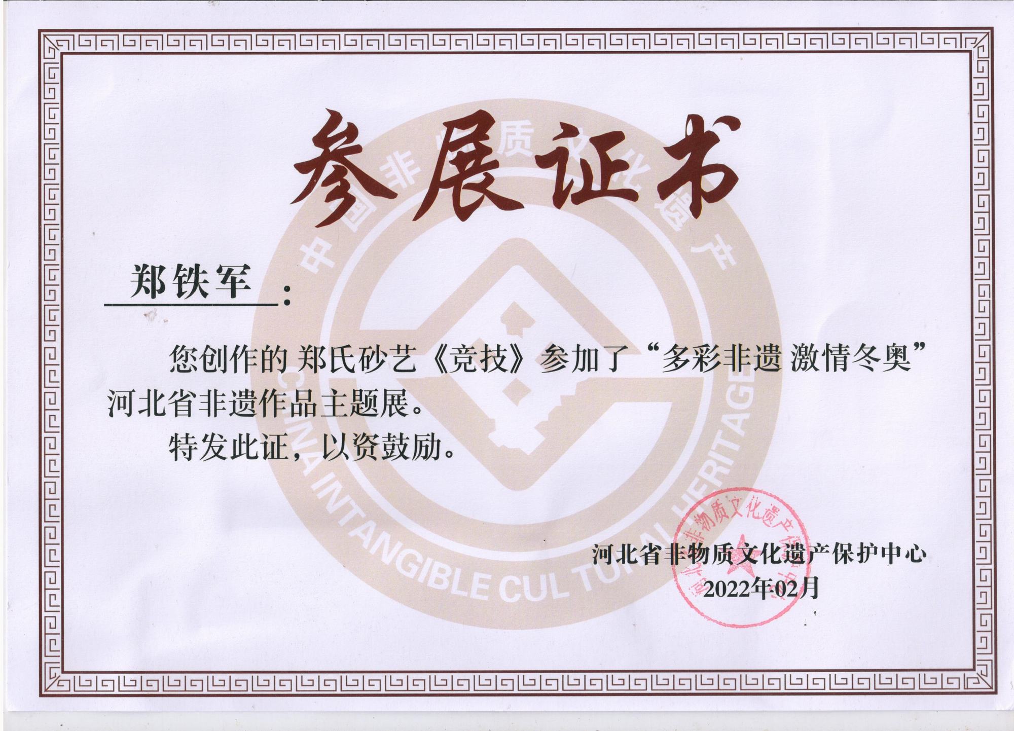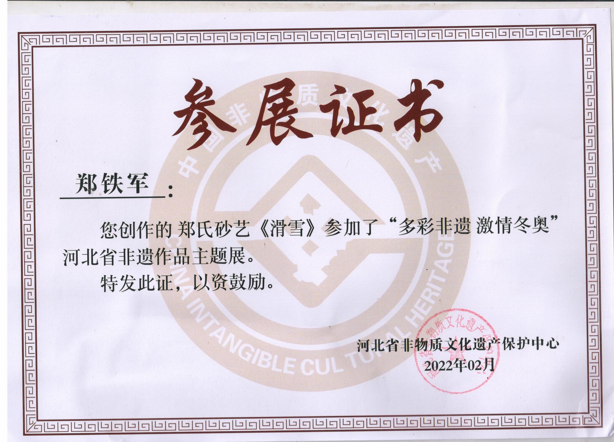 2022年北京冬奧會是我國重大歷史節(jié)點的重大標(biāo)志性活動,也是河北省推動京津冀協(xié)同發(fā)展、雄安新區(qū)規(guī)劃建設(shè)、冬奧會籌辦“三件大事”之一。因此省群眾藝術(shù)館(省非遺保護(hù)中心)按照河北省文化和旅游廳的部署在全省開展了“多彩非遺激情冬奧”非遺主題作品征集活動,本次作品以冬奧文化、冰雪文化、春節(jié)文化為題材,通過藝術(shù)展現(xiàn)冰雪運動,應(yīng)邀鄭氏砂藝執(zhí)行董事國際工藝美術(shù)大師鄭鐵軍創(chuàng)作的砂畫作品《滑雪》、《競技》兩幅作品參展,并被省群眾藝術(shù)館和省非物質(zhì)文化遺產(chǎn)保護(hù)中心永久收藏。