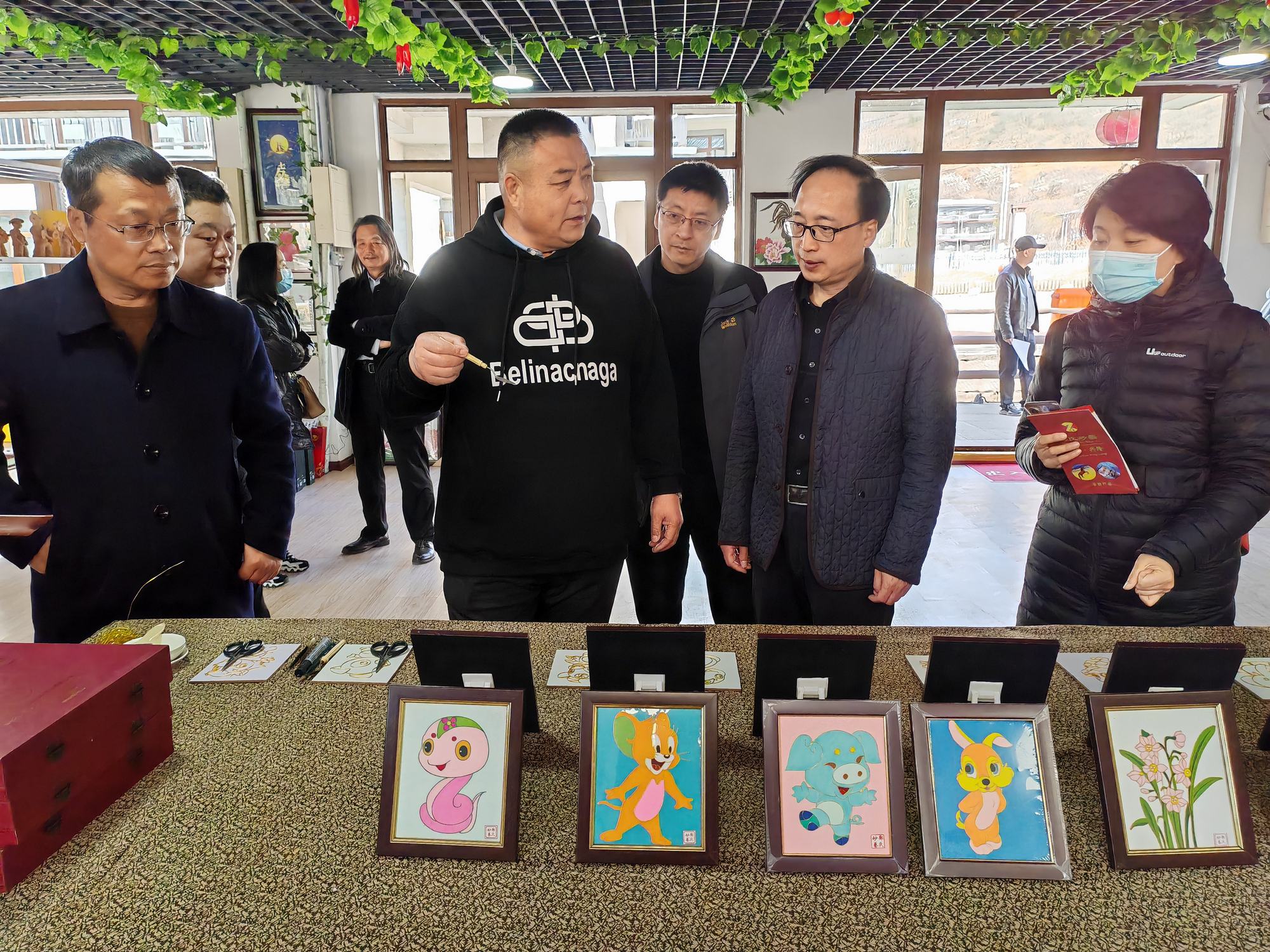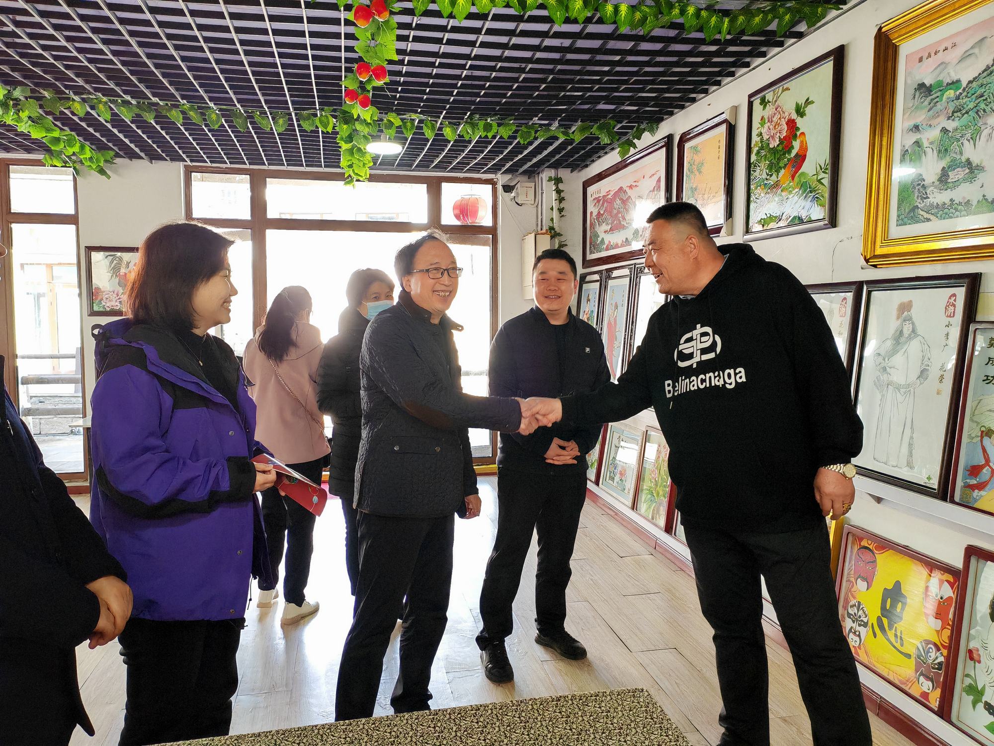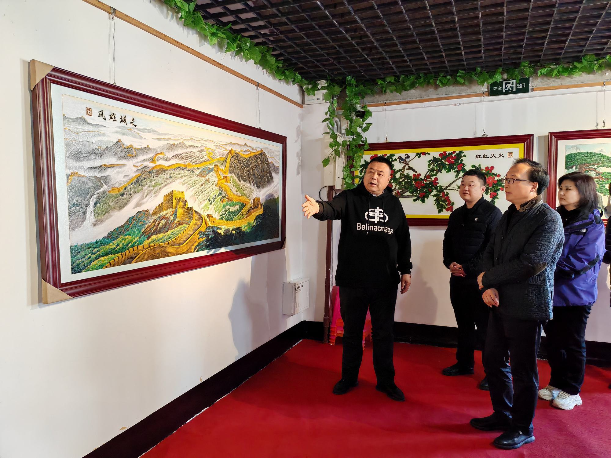 集乾釗主任一行在鄭鐵軍董事長的陪同下參觀了鄭氏砂藝非遺展館,觀看了鄭氏砂藝創(chuàng)作的各類非遺砂畫作品,考察團(tuán)領(lǐng)導(dǎo)在長城砂畫系列前駐足欣賞,對栩栩如生的長城砂畫作品給予了高度贊譽(yù)。期間董事長鄭鐵軍對近年來鄭氏砂藝非遺文化的發(fā)展情況進(jìn)行了簡單介紹。集乾釗主任對鄭氏砂藝非遺文化的傳承和發(fā)展表示了充分肯定,并對鄭氏砂藝的傳統(tǒng)手工技藝給予高度評(píng)價(jià)。