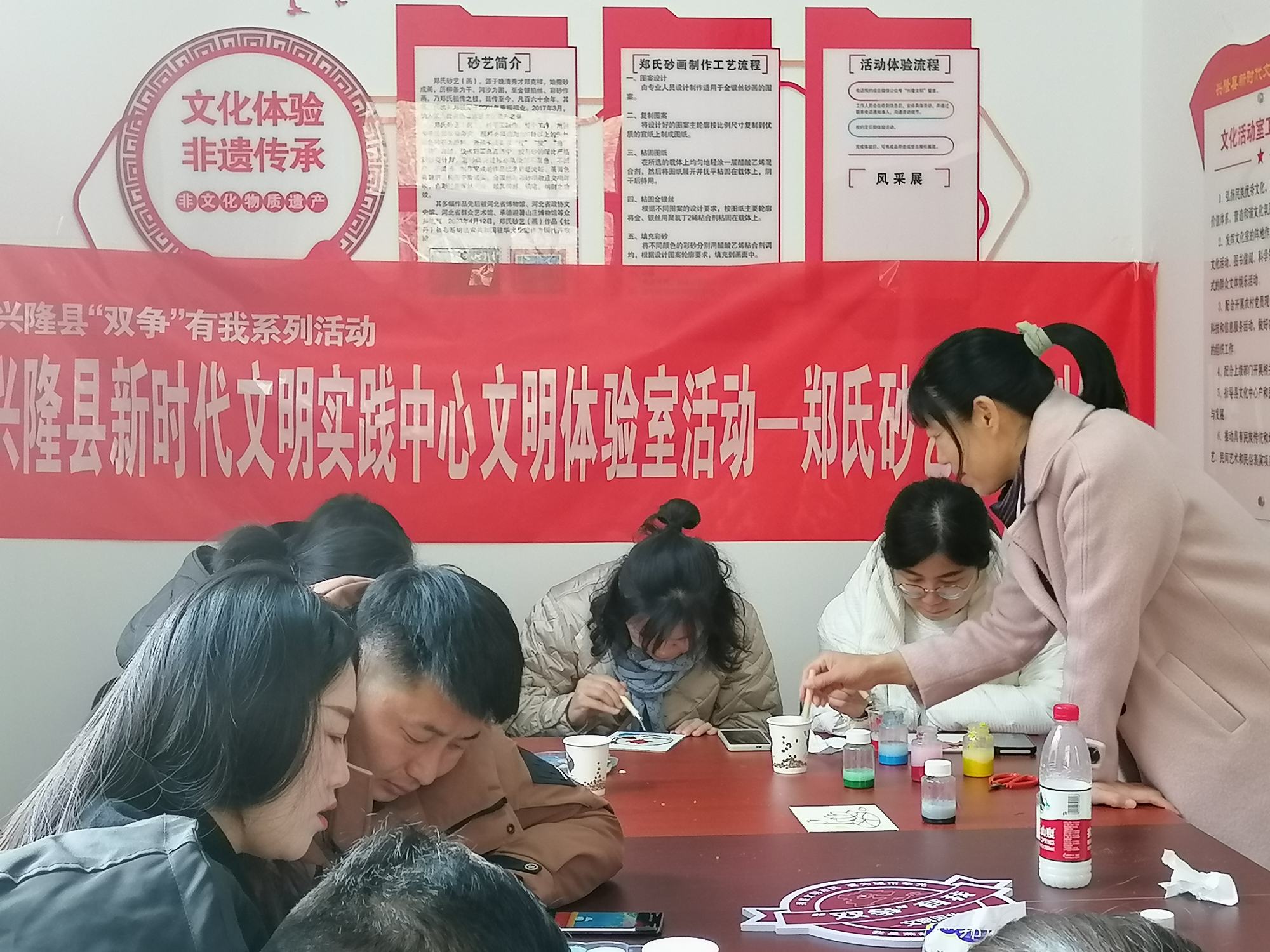 2023年11月13日,鄭氏砂藝砂畫技師應邀前往興隆縣新時代文明實踐中心文明體驗室,開展“非遺”鄭氏砂藝(畫)制作體驗活動,據(jù)了解,此次活動由中共興隆縣委宣傳部舉辦,是興隆縣“雙爭”有我系列活動之一,主要目的是傳承優(yōu)秀文化,豐富群眾文化生活,推進“雙爭”活動走深走實,推進基層文化建設,推動藝術文化發(fā)展,通過群眾喜聞樂見的文體活動促進地方文化繁榮,真正將文化惠民、服務百姓落到實處。