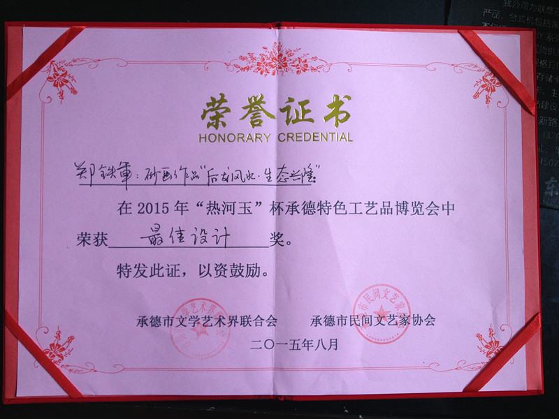 2015年8月,承德市文學(xué)藝術(shù)界聯(lián)合會(huì)和承德市民間文藝家協(xié)會(huì)舉辦了,2015年“熱河玉”杯承德特色工藝品博覽會(huì),鄭氏砂藝文化有限公司總經(jīng)理鄭鐵軍的砂畫作品“后龍風(fēng)水 生態(tài)興隆”榮獲《最佳設(shè)計(jì)獎(jiǎng)》。