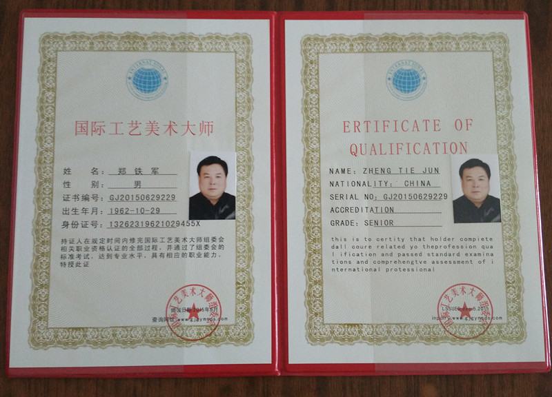 2015年6月,本公司總經(jīng)理鄭鐵軍先生,在規(guī)定時間內修完國際工藝美術大師組委會相關職業(yè)資格認證的全部過程,并通過了國際工藝美術大師組委會的職業(yè)資格標準考試,達到專業(yè)水平,具有相應的職業(yè)能力,特授“國際工藝美術大師”稱號。